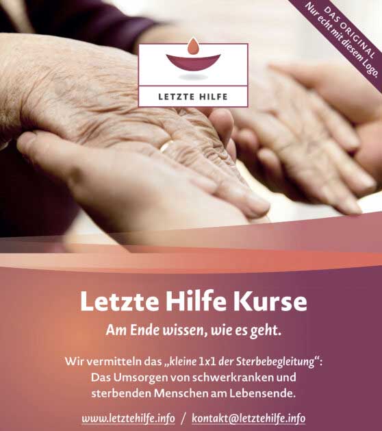 Dieser Kurs richtet sich an alle Bürger*innen, die sich über die Themen rund um Sterben, Tod und Palliativversorgung informieren wollen. Sterbebegleitung ist keine Wissenschaft, sondern praktizierte Mitmenschlichkeit, die in der Familie direkt und der Nachbarschaft möglich ist. Der Kurs vermittelt Wissen und Orientierung, einfache Handgriffe und viele wertvolle Informationen.