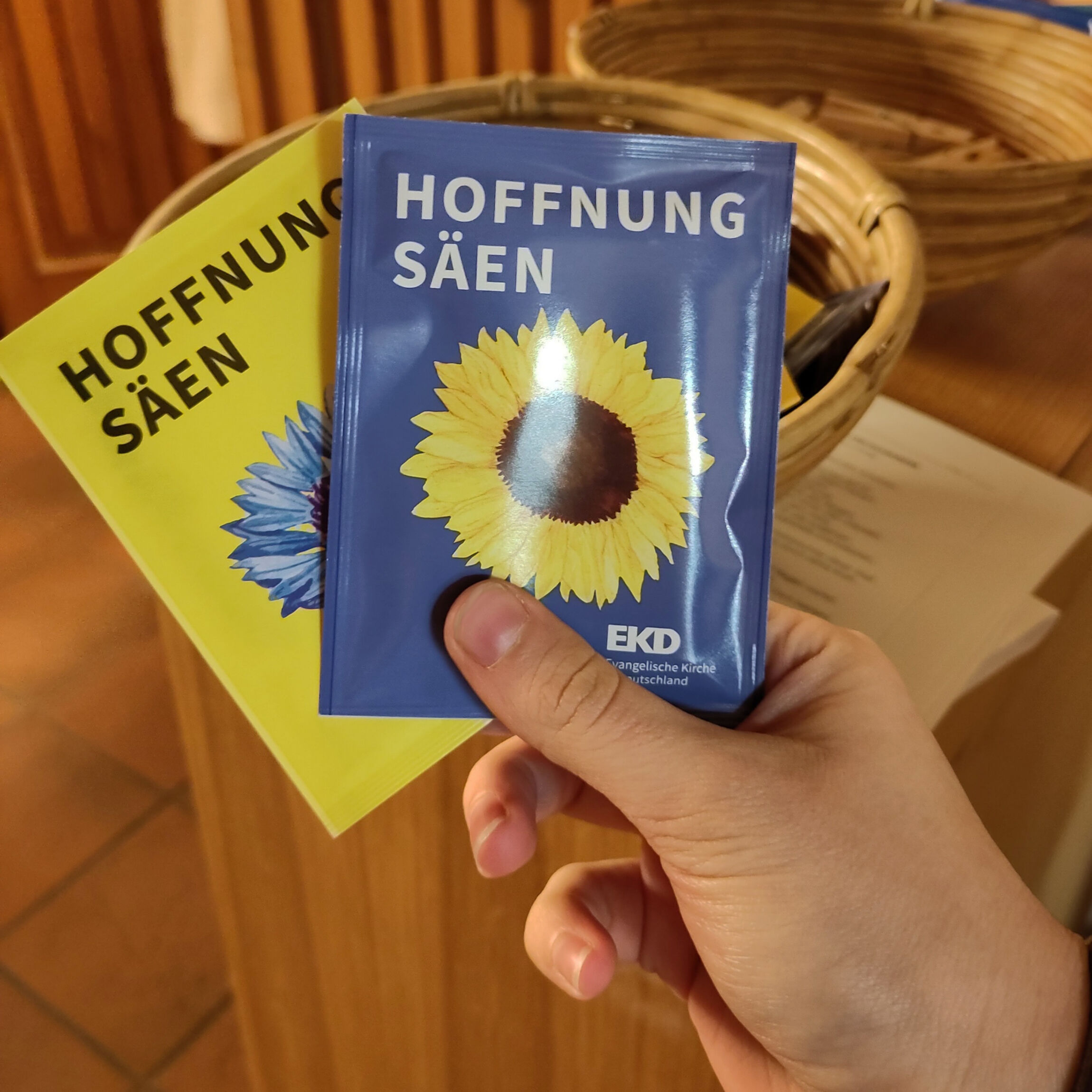 Die Kirchenkreis beteiligt sich auch an einer Hoffnungsaktion der EKD (Evangelische Kirche in Deutschland) unter #hoffnungsäen. So konnten die Gäste im Anschluss an die Andacht Samentütchen für blaue Kornblumen und gelbe Sonnenblumen – in den Farben der ukrainischen Flagge - mit nach Hause nehmen. Diese können im Frühjahr und Sommer in Gärten den Friedenswunsch auch optisch betonen.