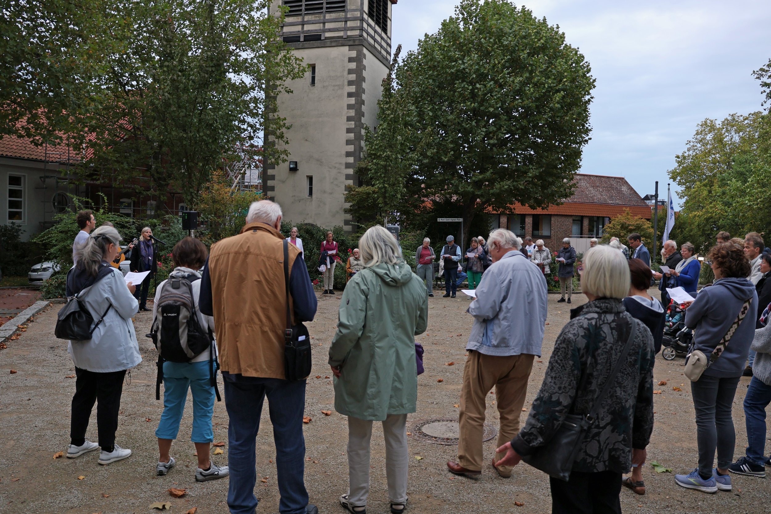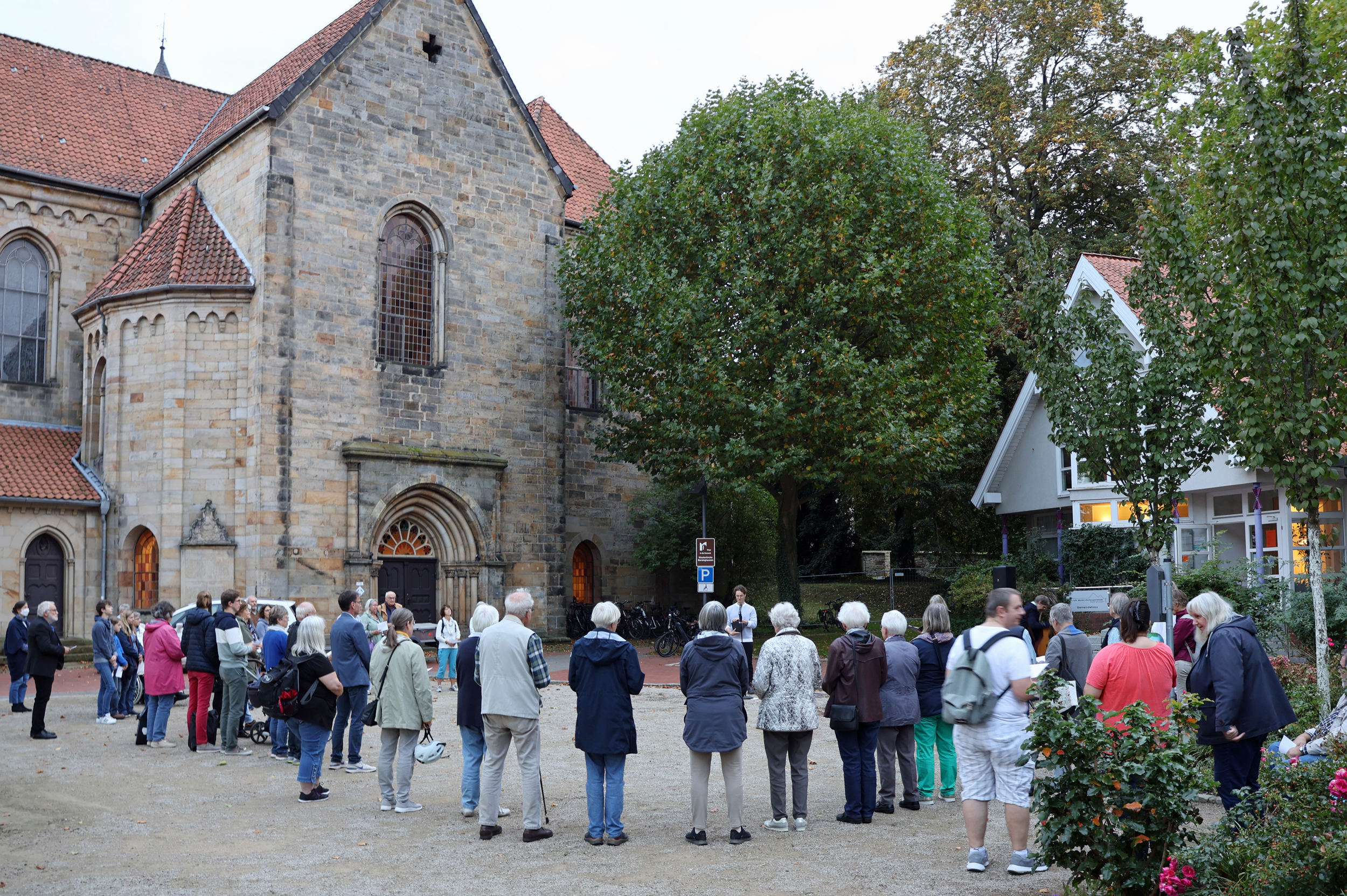 Ihren Wunsch nach Frieden zeigten gut 50 Gäste mir ihrer Teilnahme am Friedensgebet der christlichen Gemeinden am Freitagabend, 13. Oktober, vor der Klosterkirche Barsinghausen. Pastorin Uta Junginger gestaltete zusammen mit ihrer Kollegin Elke Pankratz-Lehnhoff und Pastor Sebastian Kühl die kurze Andacht unter freiem Himmel. "Wir sind schockiert angesichts der Terrorangriffe in Israel und angesichts der eskalierenden Gewalt. Wir sind schockiert über tausende Tote und beten für den Frieden", sagte Uta Junginger in ihrer Begrüßung und erinnerte an eine Reise einer Barsinghäuser Gruppe im Frühjahr in Israel, die dort die Heilige Stadt Jerusalem und die Stätten im Land erlebten. "Wir sind bestürzt und fassungslos über die Grausamkeit der Gewalt, unter der vor allem die Zivilbevölkerung leidet", machte sie deutlich. Im Wechsel lasen die Pastorinnen und Pastor Friedensworte aus der Bibel, beteten gemeinsam mit den Gästen und sangen Friedenslieder.