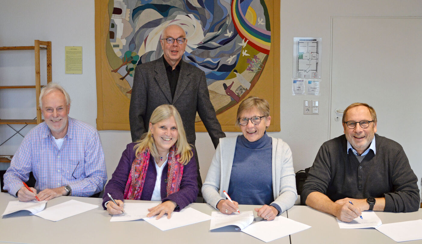 Edmund Jansen (Vorstand ENER:GO), Pastorin Uta Junginger, Pastor Jürgen Holly, Annette Kuban (Ortskirchenvorstandsvorsitzende), Udo Sahling (Vorstand ENER:GO/Basche erneuerbar) bei der Vertragsunterzeichnung.