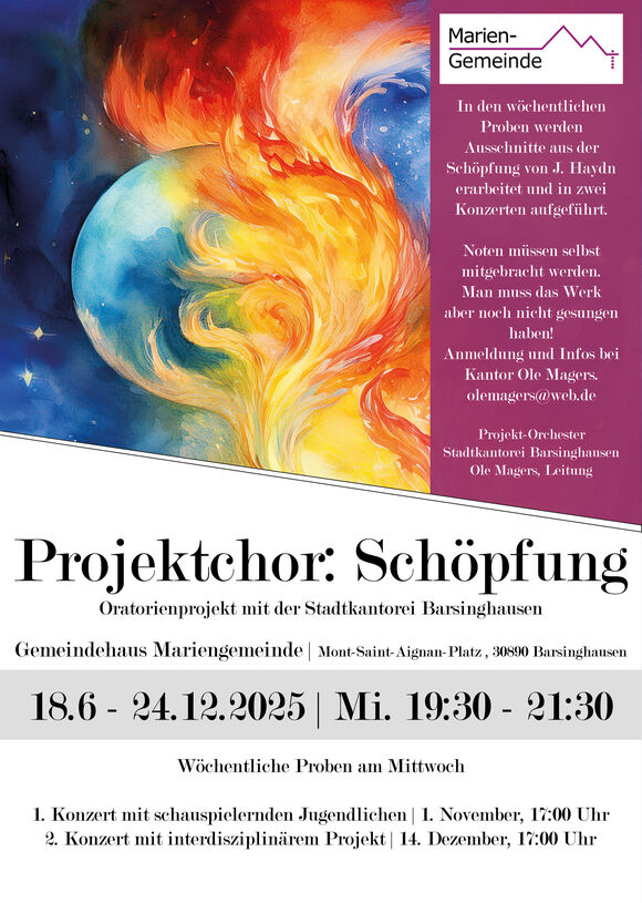 Kantor Ole Magers lädt Sängerinnen und Sänger ein, sich im Rahmen eines Projektchores am nächsten großen Vorhaben der Kantorei Barsinghausen zu beteiligen. Ab Mittwoch, 18. Juni, beginnen die wöchentlichen Proben für das Oratorium "Die Schöpfung" von Joseph Haydn. Ziel sind zwei öffentliche Konzerte im November und Dezember 2025. Das Projekt steht unter dem Titel perspektiven:schöpfung. Die Teilnahme ist offen für alle Interessierten mit Chorerfahrung.