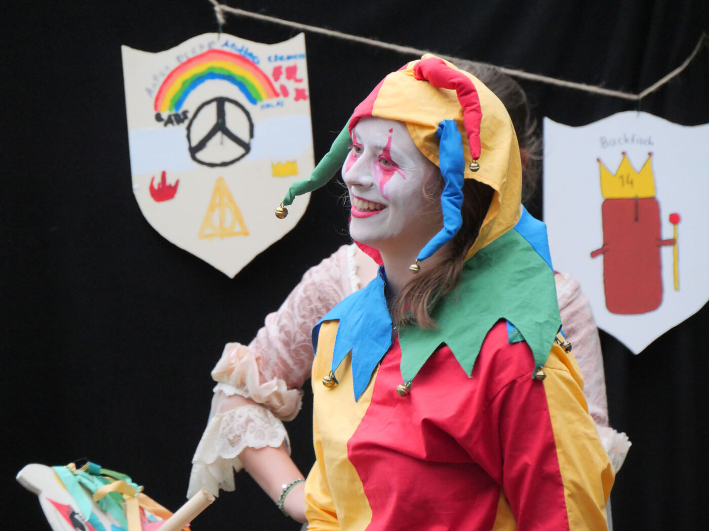 Gaukler „Gaukel Hauke“ amüsiert die Kinder.