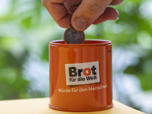 Spendendose von Brot für die Welt, dem Hilfswerk der evangelischen Landes- und Freikirchen und ihrer Diakonie. Copyright: Hermann Bredehorst/Brot für die Welt