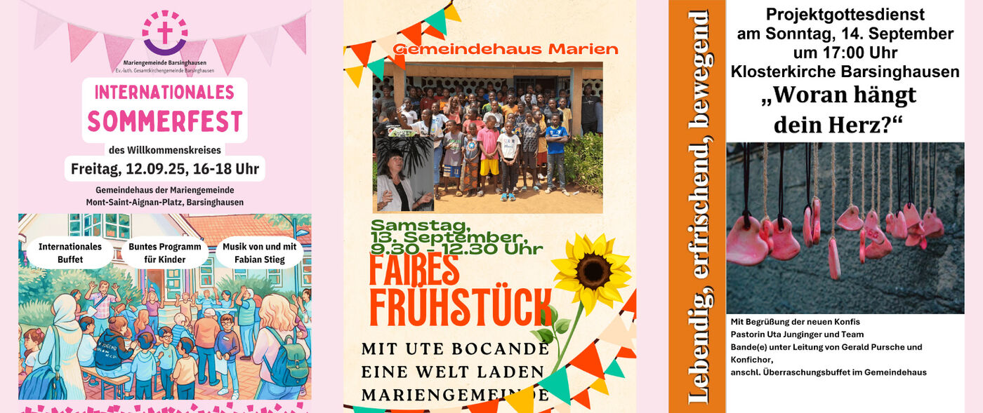 Die Mariengemeinde lädt zu zwei besonderen Veranstaltungen an diesem Wochenende ein: Am Freitag, 12.9., zum Internationalen Sommerfest von "Willkommen in Basche" von 16 bis 18 Uhr. Mit Begegnung, Spiel und Spaß für alle Gäste und leckeren internationalen Speisen. Und am Samstag, 13.9., wird dann fair gefrühstückt. Ute Gierczynski-Bocandé berichtet aus dem Schülerhilfeprojekt in Senegal. Der Eintritt ist frei und die Spenden für das Frühstück gehen direkt an das Projekt. Ebenfalls am Wochenende werden im Projektgottesdienst am Sonntag um 17 Uhr die neuen Konfis begrüßt.