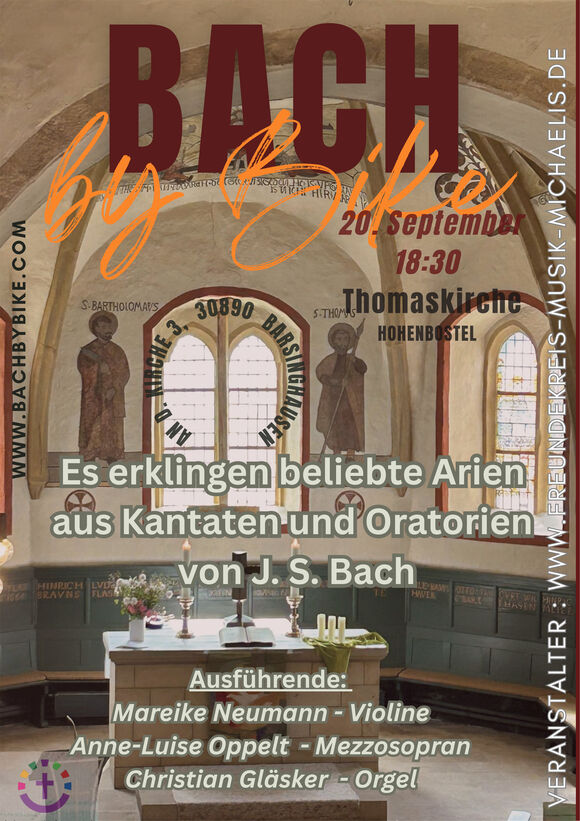 Am 20. September 2025 um 18:30 Uhr ist das Ensemble "Bach by Bike" in der Thomaskirche in Hohenbostel zu Gast. Zu hören sind beliebte Arien aus Kantaten und Oratorien von Johann Sebastian Bach. Ausführende sind: Mareike Neumann (Violine), Anna-Luise Oppelt (Mezzosopran) und Christian Gläsker (Orgel). Wieviel Sie am Ausgang geben, entscheiden Sie selbst. Wir wünschen viel Freude mit schöner Musik!