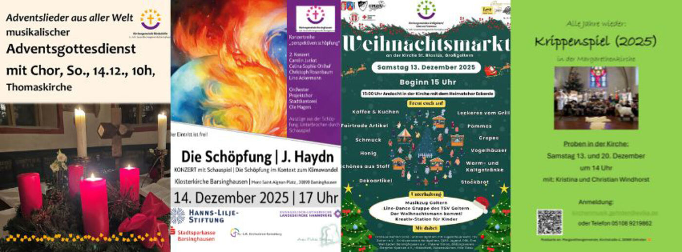 Offene Kirche in Gehrden zum Weihnachtsmarkt, Krippenspielproben ebenfalls in Gehrden, Offenes Singen in der Holtenser Kirche, Konzert in der Klosterkirche Barsinghausen, Weihnachtsmarkt in Großgoltern, Meditation in Hohenbostel und Benthe, Frühstück in Ronnenberg, lebendiger Advent in Weetzen... die Einladungen am kommenden Wochenende in unseren Kirchen- und Kapellengemeinden sind vielfältig und so bunt, wie das ganze Leben im Advent. Und über "mehr lesen" sehen Sie alle Termine, die so eingetragen wurden. Was fehlt? Gern ein Hinweis an Sabine Freitag.
