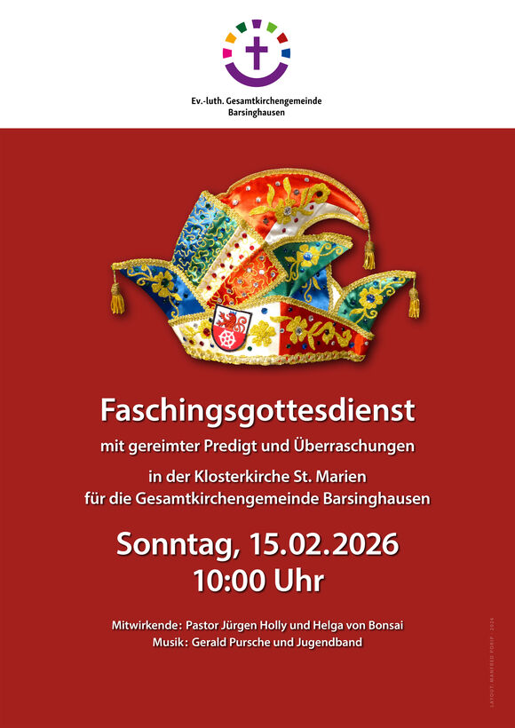 Am Sonntag, 15.Februar, ist wieder Faschingsgottesdienst um 10 Uhr. Pastor Jürgen Holly hält auch in diesem Jahr seine Predigt in gereimter Form. Das Motto: 'Ich fragte Gott: "Was soll ich machen?" - Gottes Antwort: "Lachen!"'