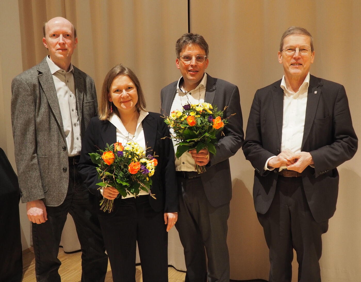 Ein neues Team für den Kirchenkreis Ronnenberg: Der Vorsitzende des Wahlausschusses, Michael Rehren (links) und der Regionalbischof i.R. Dr. Hans Christian Brandy (rechts) gratulierte dem Ehepaar Dr. Damaris und Michael Grimmsmann zur Wahl ins Superintendentenamt. Bild: Sabine Freitag