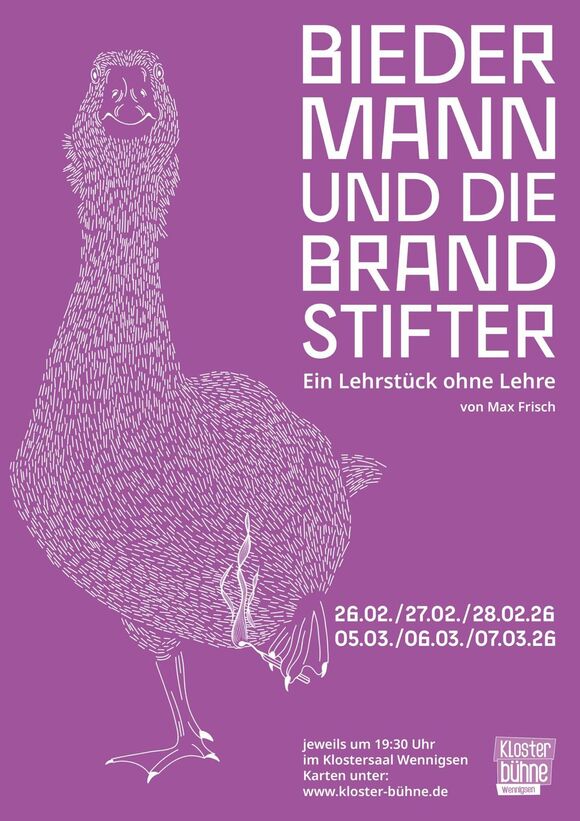 Die Klosterbühne der Marien-Petri-Kirchengemeinde Wennigsen spielt wieder am 26. bis 28. Februar und vom 5. bis 7. März jeweils um 19.30 im Klostersaal in Wennigsen. "Biedermann und die Brandstifter" von Max Frisch unter der Regie von Noa Wessel (Theater zwischen den Dörfern) wird in Szene gesetzt. Kartenreservierungen unter info@kloster-bühne.de oder über https://www.kloster-bühne.de/. Eintritt ist frei, Spenden sind willkommen.