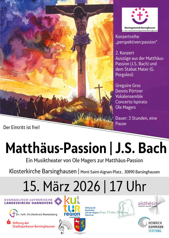 Mit der Uraufführung des Musiktheaterstückes „Der Sohn, der starb“ (Ole Magers) hören Sie eine Verarbeitung der Matthäus-Passion (J.S. Bach) und des Stabat Maters (G.B. Pergolesi). Dieses Konzert findet am 15. März um 17 Uhr in der Klosterkirche Barsinghausen statt und wird etwa 3 Stunden dauern inklusive einer Pause. Das Theaterstück spielt zum Zeitpunkt der Grablegung Jesu – zwischen Kreuzigung und Auferstehung und verarbeitet Themen wie Sünde, Vergeben, Trauer, Schuld. Das Theaterstück ist für Erwachsene gedacht und erzählt eine fiktive Geschichte zweier Männer nahe des Grabes Jesu.